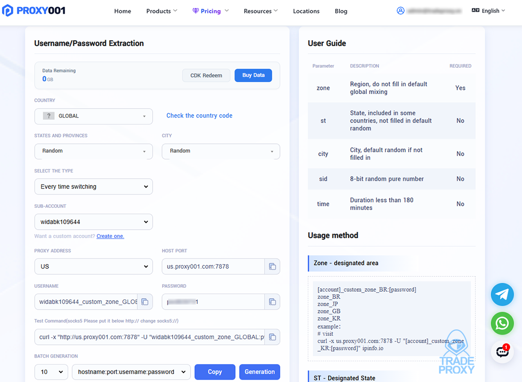 When purchasing Proxy001 at TRADEPROXY, customers will receive a CDKey (top-up code) with a corresponding GB amount, featuring lifetime validity.